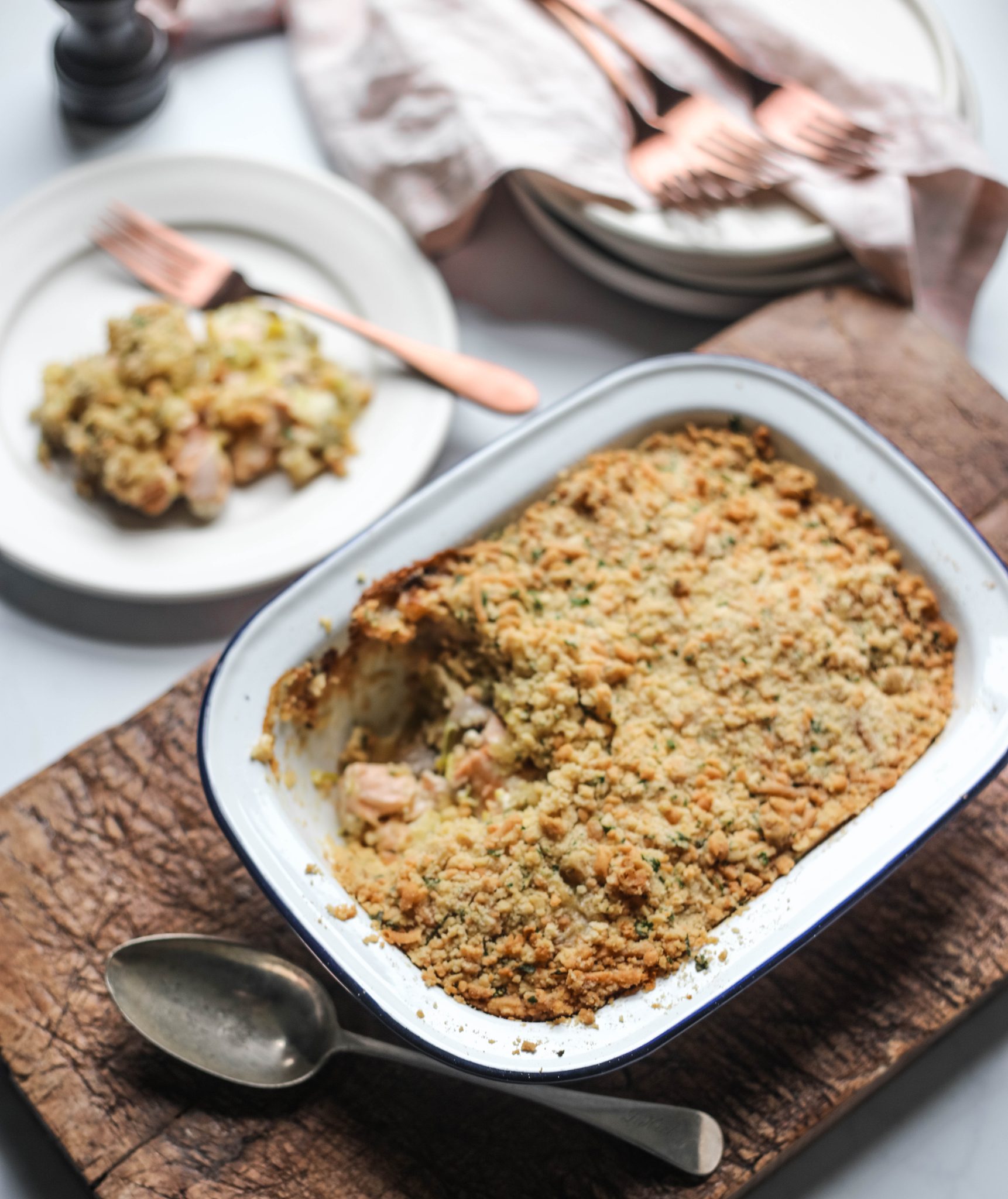 Place the salmon filling in a 1 litre capacity baking tray. Top with crumble mix and bake in the oven for 30 minutes or until the crumble is golden and the edges are starting to bubble.