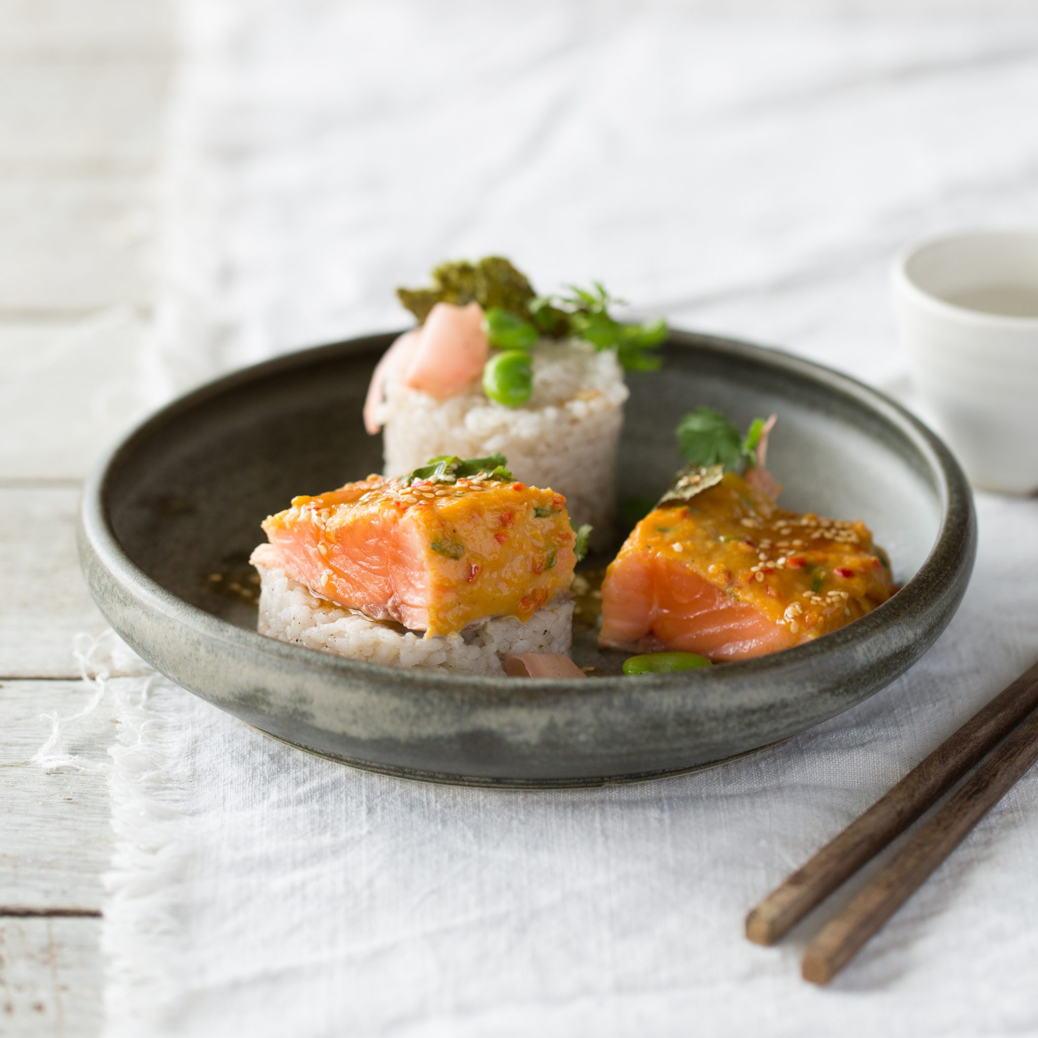 Remove the salmon pieces from the white miso marinade and wipe off the excess before placing each piece into a baking tray lined with grease proof paper and bake for 15 minutes or until fish is firm and then plate up with rice, broad beans, coriander, nori and sesame dressing.