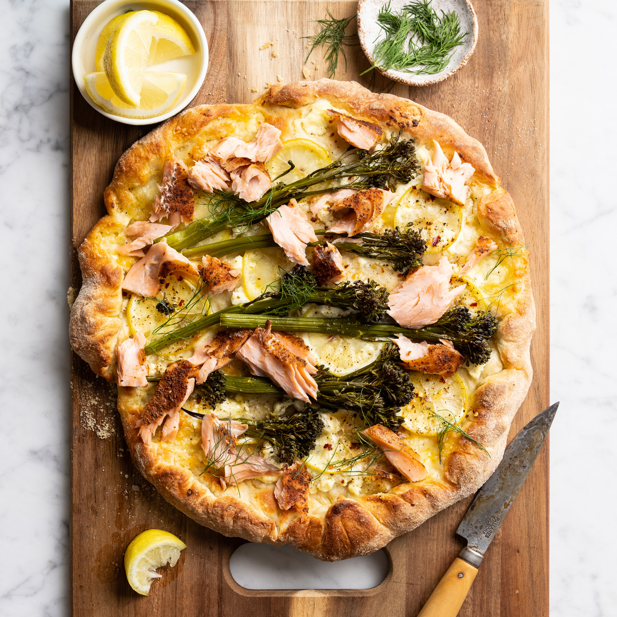 Blackened Spice Wood Roasted Salmon Pizza with Lemon and Broccolini